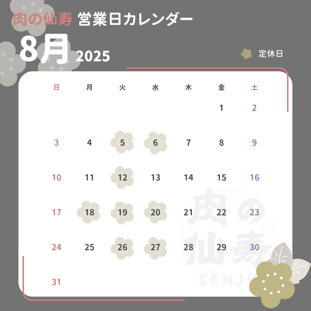 2025年 9月|定休日のお知らせ 2025 8/29 こんにちは☺️精肉店 肉の仙寿の9月のお休みは下記となります!9/2(火)9/8(月)9/9(火)9/15(月)9/16(火)9/22(月)9/23(火)9/30(火)みなさまのご来店お待ちしております! 定休日