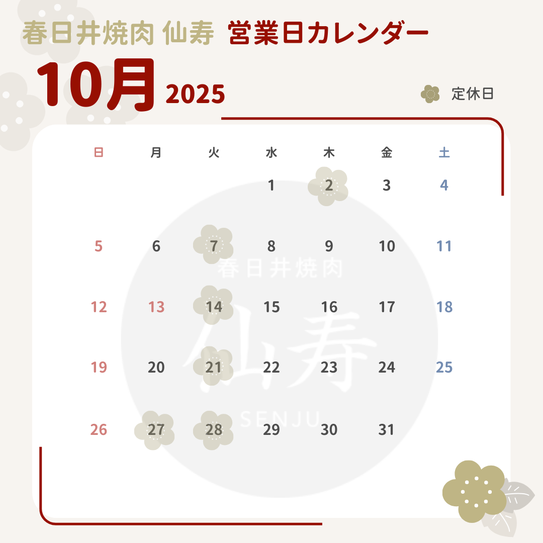 精肉店 肉の仙寿の10月のお休みは下記となります!