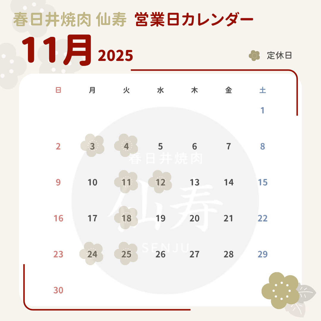 2025年 11月|定休日のお知らせ 2025 10/30 定休日 2025年10月30日こんにちは😊春日井焼肉 仙寿の11月のお休みは下記となります!11/3(月)11/4(火)11/11(火)11/12(水)11/18(火)11/24(月)11/25(火)皆さまのご来店お待ちしております!! 定休日 関連記事 【本日の営業時間変更のお知らせ】 2025年10月20日 仙寿の日イベント 2025年10月7日 2025年 10月|定休日のお知らせ 2025年9月29日 2025年 9月|定休日のお知らせ 2025年8月29日 お盆(8月9日〜8月16日)営業のお知らせ 2025年8月4日 📣【夏のメガキャンペーン開催中】 2025年7月29日 2025年 8月|定休日のお知らせ 2025年7月23日 2025年 7月|定休日のお知らせ 2025年6月30日
