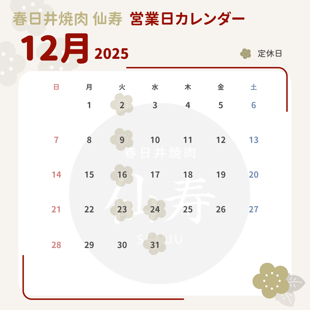 2025年 12月|定休日のお知らせ 2025 12/01 定休日 2025年12月1日こんにちは😊春日井焼肉 仙寿の12月のお休みは下記となります!12/2(火)12/9(火)12/16(火)12/23(火)12/24(水)12/31(水)皆さまのご来店お待ちしております!! 定休日 関連記事 2025年 11月|定休日のお知らせ 2025年10月30日 【本日の営業時間変更のお知らせ】 2025年10月20日 仙寿の日イベント 2025年10月7日 2025年 10月|定休日のお知らせ 2025年9月29日 2025年 9月|定休日のお知らせ 2025年8月29日 お盆(8月9日〜8月16日)営業のお知らせ 2025年8月4日 📣【夏のメガキャンペーン開催中】 2025年7月29日 2025年 8月|定休日のお知らせ 2025年7月23日